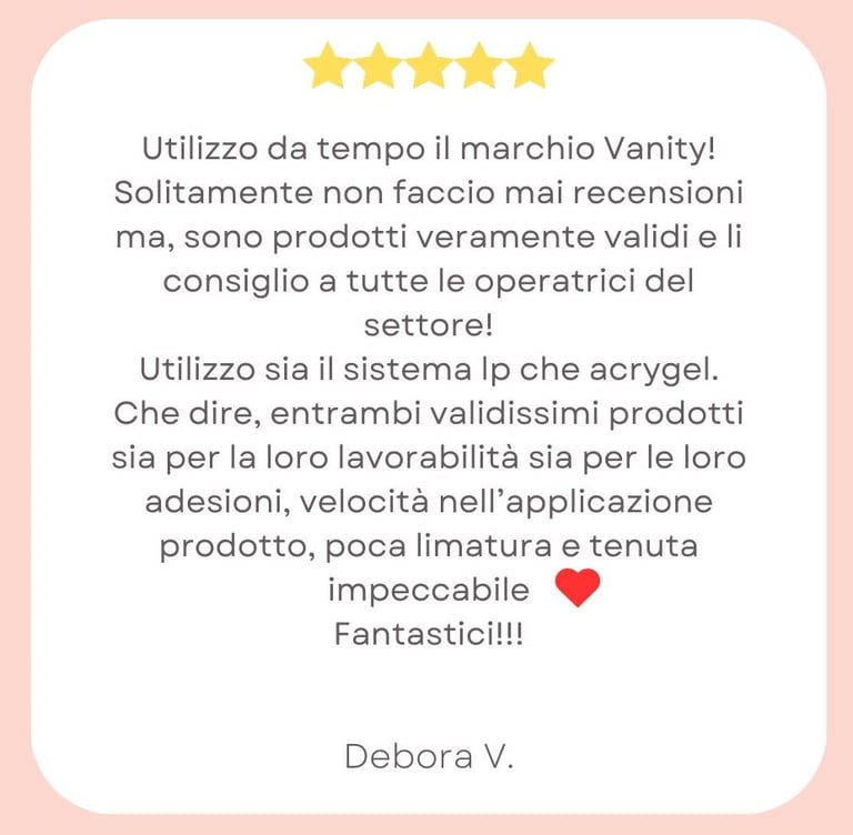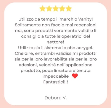 Offriamo una gamma di soluzioni innovative che garantiscono risultati straordinari e una durata impeccabile. Con formule avanzate e ingredienti di alta qualità, TPO free ed HEMA free. Non accontentarti di meno, scegli la professionalità e l’eccellenza per le tue clienti e riscopri il piacere di offrire mani sempre perfette con Vanity Nails